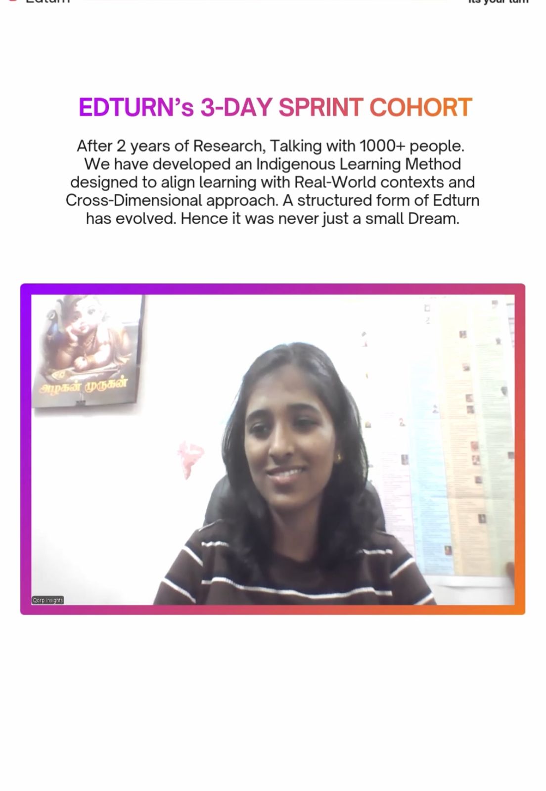 With experience across UX research, product design, PR, and business strategy, she has worked with 20+ startups, building products, narratives, and learning frameworks. A university rank holder, product patent contributor, and NIT Trichy design awardee, she has also designed AI-driven applications and real-world learning systems. Through Edturn, she focuses on one goal: helping students move beyond passive learning and develop the ability to think independently, understand the world, and express themselves with clarity and confidence.